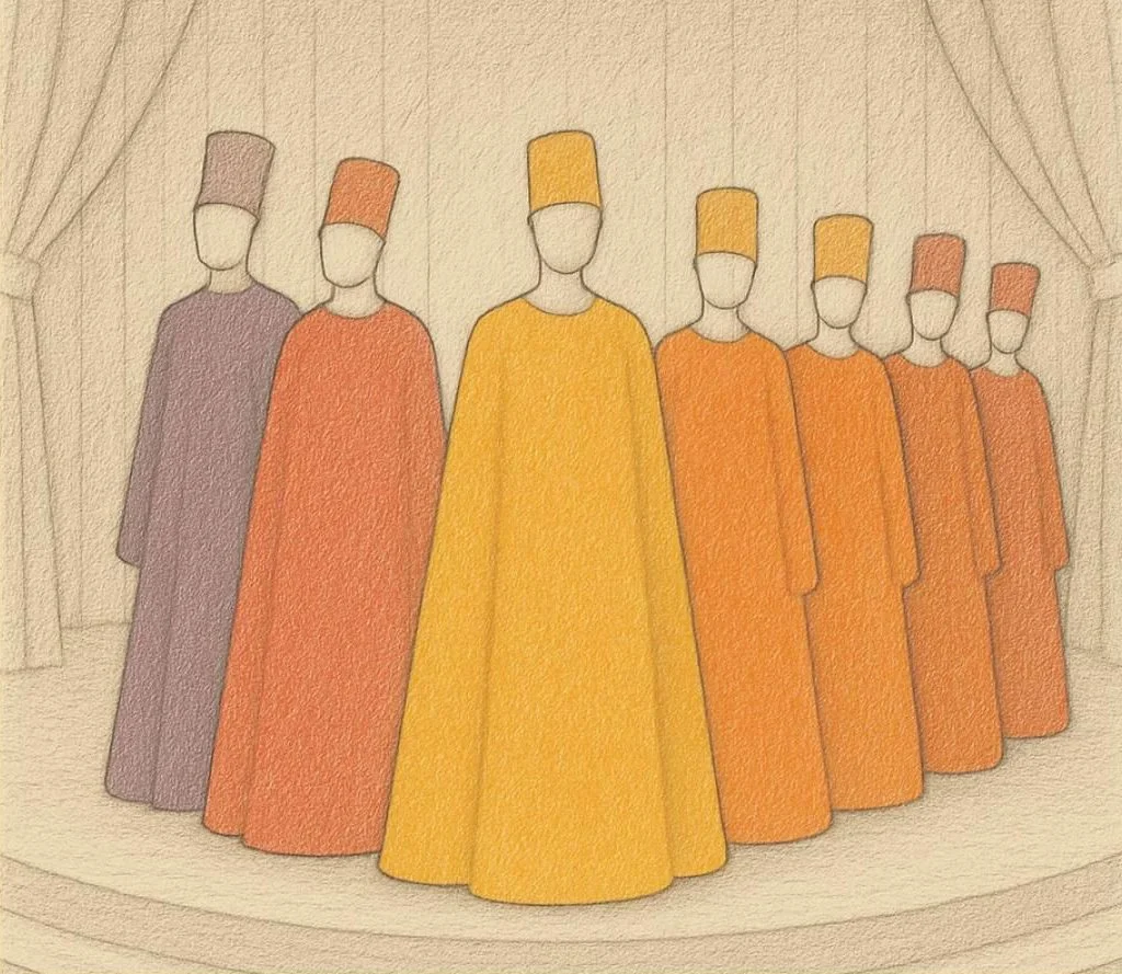 Rabih Kayrouz’s brief set an ambitious stage: the chorus, which made up the bulk of the characters, would have three distinct costumes, one for each act, with a palette that evolved from dim, earthy tones to vibrant hues, culminating in explosive gold, black, and flashes of red. The chorus, envisioned as a static presence embodying the history of the karkhana, would draw on Levantine and Lebanese mountain dress, Roman temples, and Ottoman-era military attire, all reimagined as contemporary streetwear with goldwork detailing, sculptural, exaggerated, and genderless silhouettes that were symbolic rather than literal. Costumes would evolve subtly between acts through additions and refinements rather than complete changes, prioritizing volume, cohesion, and graphic clarity while avoiding orientalist tropes.