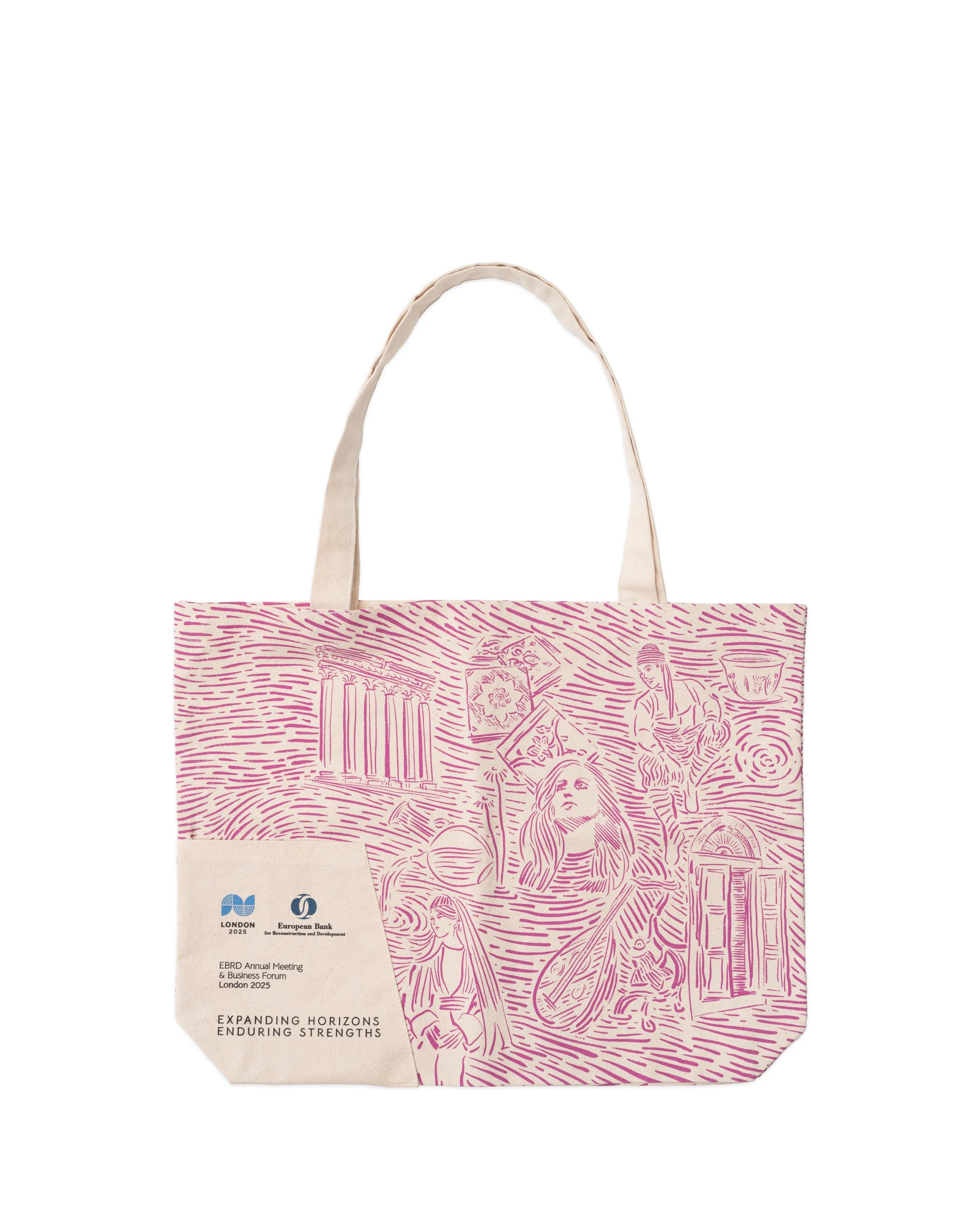 CSB facilitated the design and production of custom tote bags for the European Bank for Reconstruction and Development (EBRD) Annual Meeting and Business Forum, London 2025. The canvas totes featured illustrations of Lebanese cultural icons and symbols by alumnus Ahmed Amer.